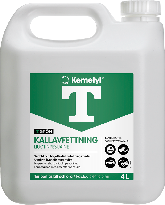 T-Grön® Kallavfettning Verkar Snabbt Och Är Ett Högeffektivt Kallavfettningsmedel För Att Ta Bort Smuts, Avlagringar Av Asfalt, Olja, Tjära Och Fett. Avfettningsmedlet T-Grön® Kallavfettning Är Även Lämpligt För Motortvätt. – KEMETYL