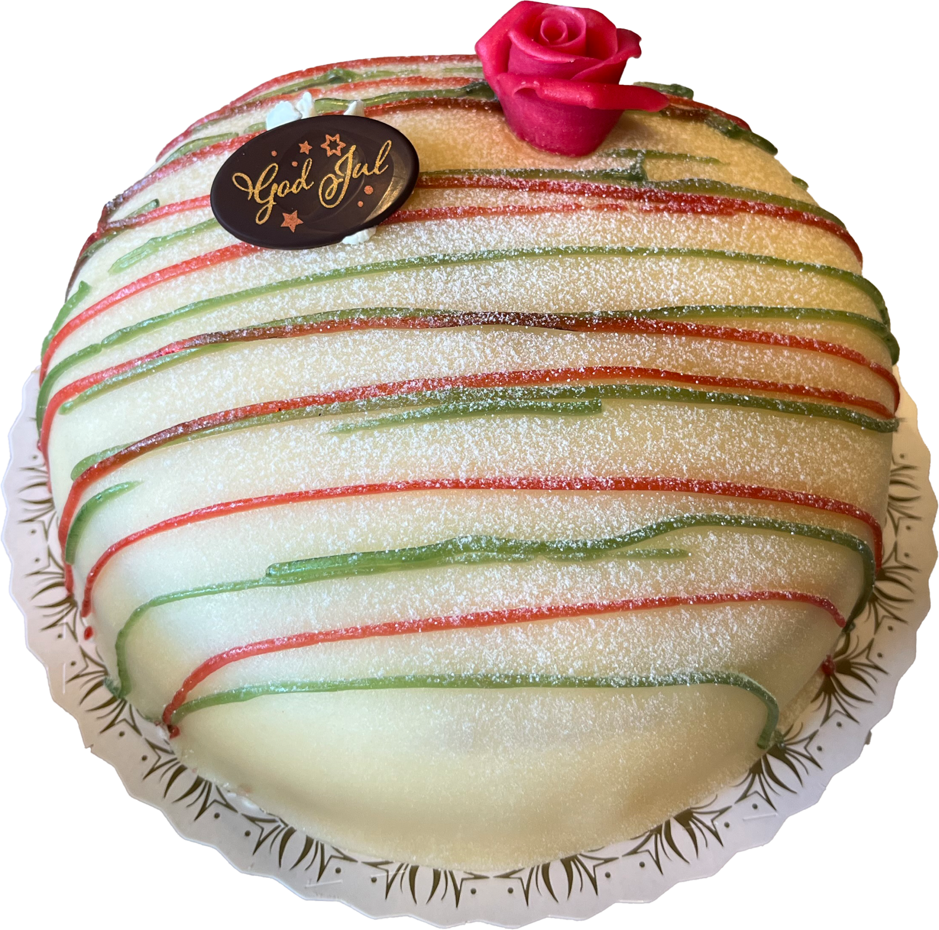 Fira jul med vår klassiska prinsesstårta som har fått en julinspirerad dekor! En tårta med mjuk sockerkaksbotten och ljuvlig fyllning med hallonsylt, vaniljkräm och vispgrädde. Tårtan är toppad med ett marsipanlock, spritsad gelé, röd marsipanros och en choklad-dekoration som önskar God Jul. Bakat i butik av våra bagare!