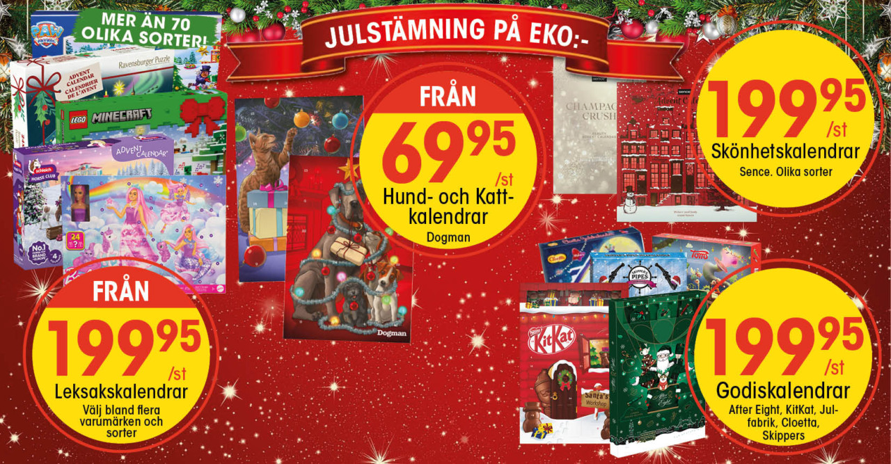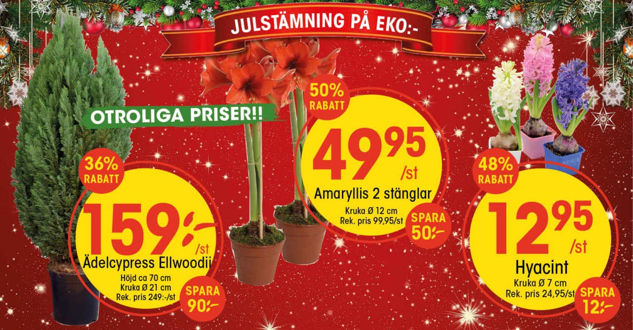 Välkommen till vår stora och magiska julmarknad! Förgyll din jul med härliga dekorationer, fin belysning, jultomtar, julgranar och mycket mycket mer... På EKO:- hittar du allt som hör julen till!