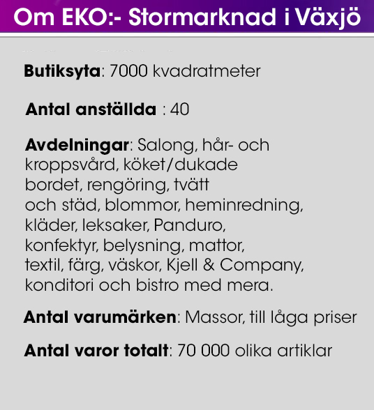 EKO:- Stormarknad ägs av familjen Bergendahl sedan mitten av 70-talet. Det är samma ägare som till Glitter och Granit. Det nya varuhuset i Växjö erbjuder hela 7 000 kvadratmeter – alltså gott om plats för en riktig shoppingupplevelse.