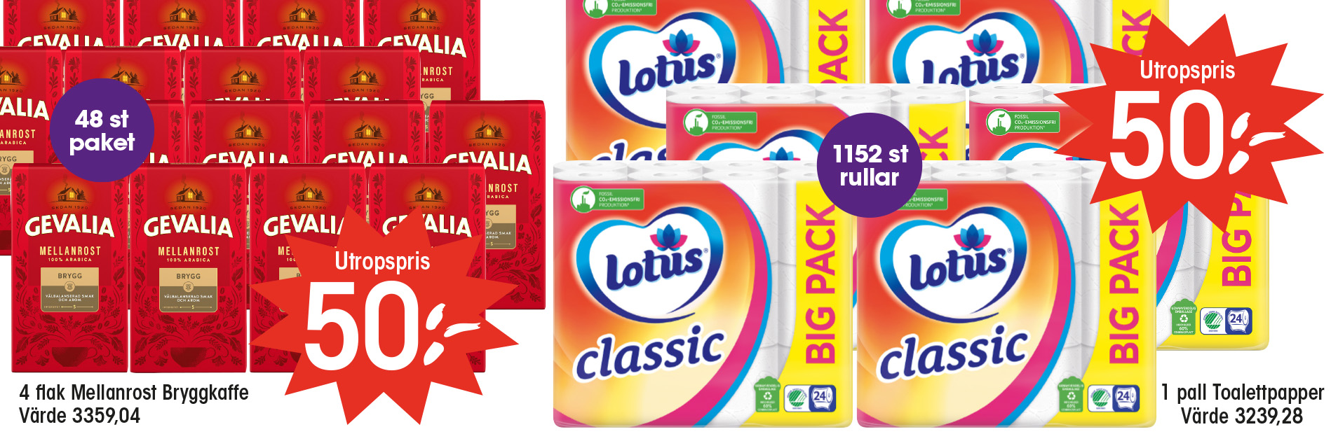 - 1 pall Toalettpapper (48 st 24-pack = 1152 st rullar) – Värde: 3239,28
