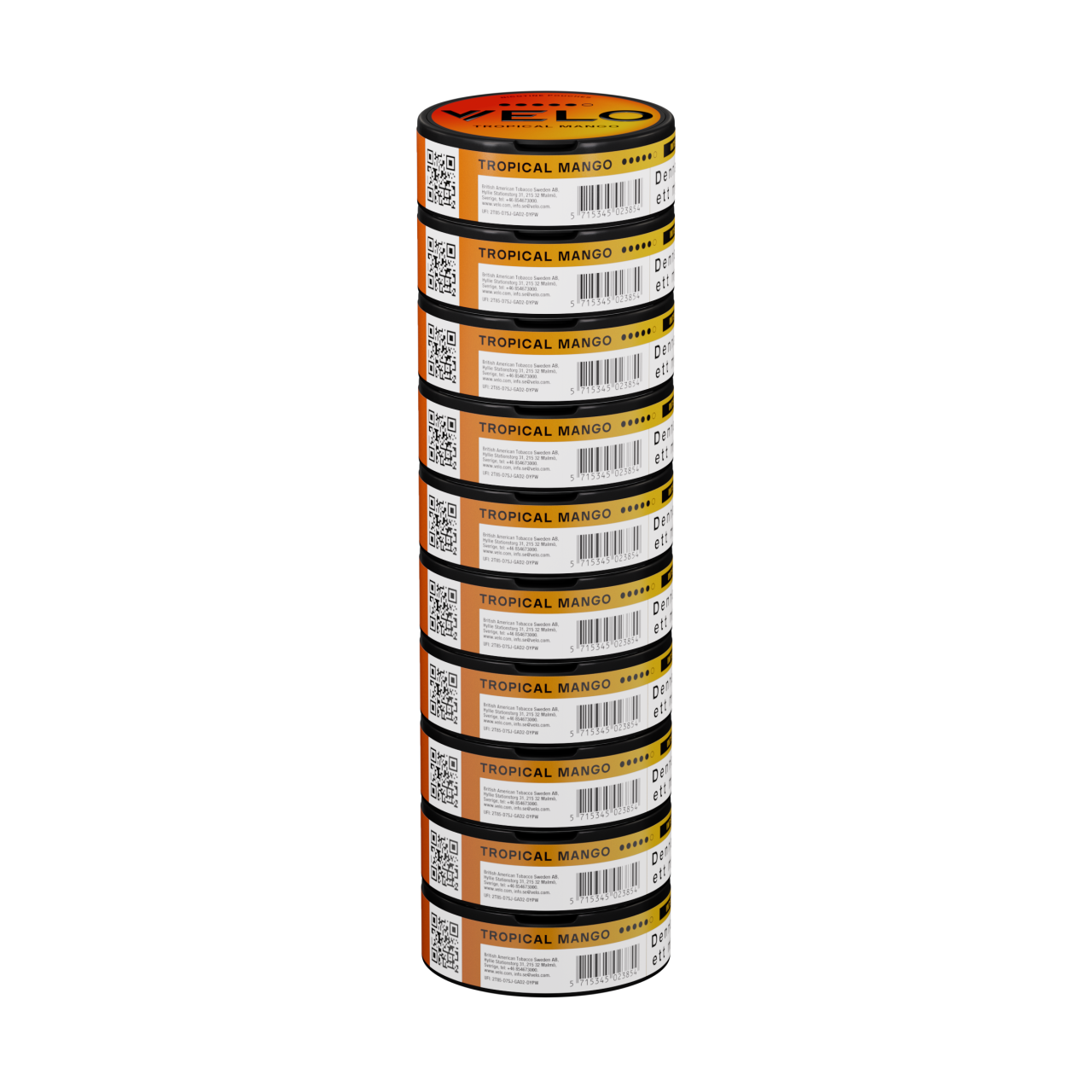 VELO Tropical Mango med smak av de tropiska frukterna mandarin, passionsfrukt och mango i hög nikotinhalt.
