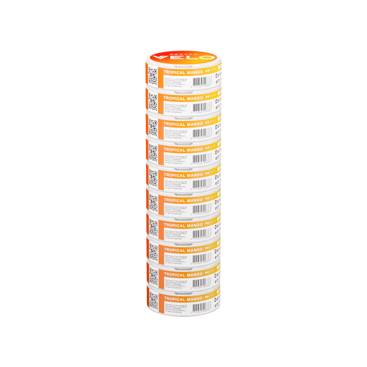 VELO Tropical Mango med smak av de tropiska frukterna mandarin, passionsfrukt och mango.