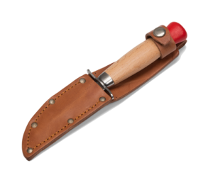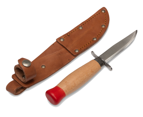 Scoutkniv Av Klassiskt Snitt. Dubbel Parerstång. Handtag I Ofärgat Trä. Slida I Naturfärgat, Äkta Läder Gör Modellen Komplett. Knivblad: 8,5 Cm Totallängd: 19 Cm. – BRIV