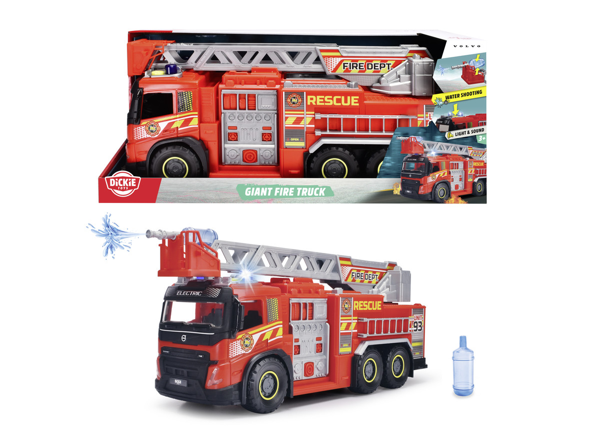 Volvo Brandbil, 57 Cm – DICKIE – Volvo brandbil från Dickie Toys med frihjul, förlängnings- och vridbar stege samt vattensprutarfunktion. Inklusive 2 vattentankar. Skala: 1:16. Längd: 57 cm. Från 3 år.