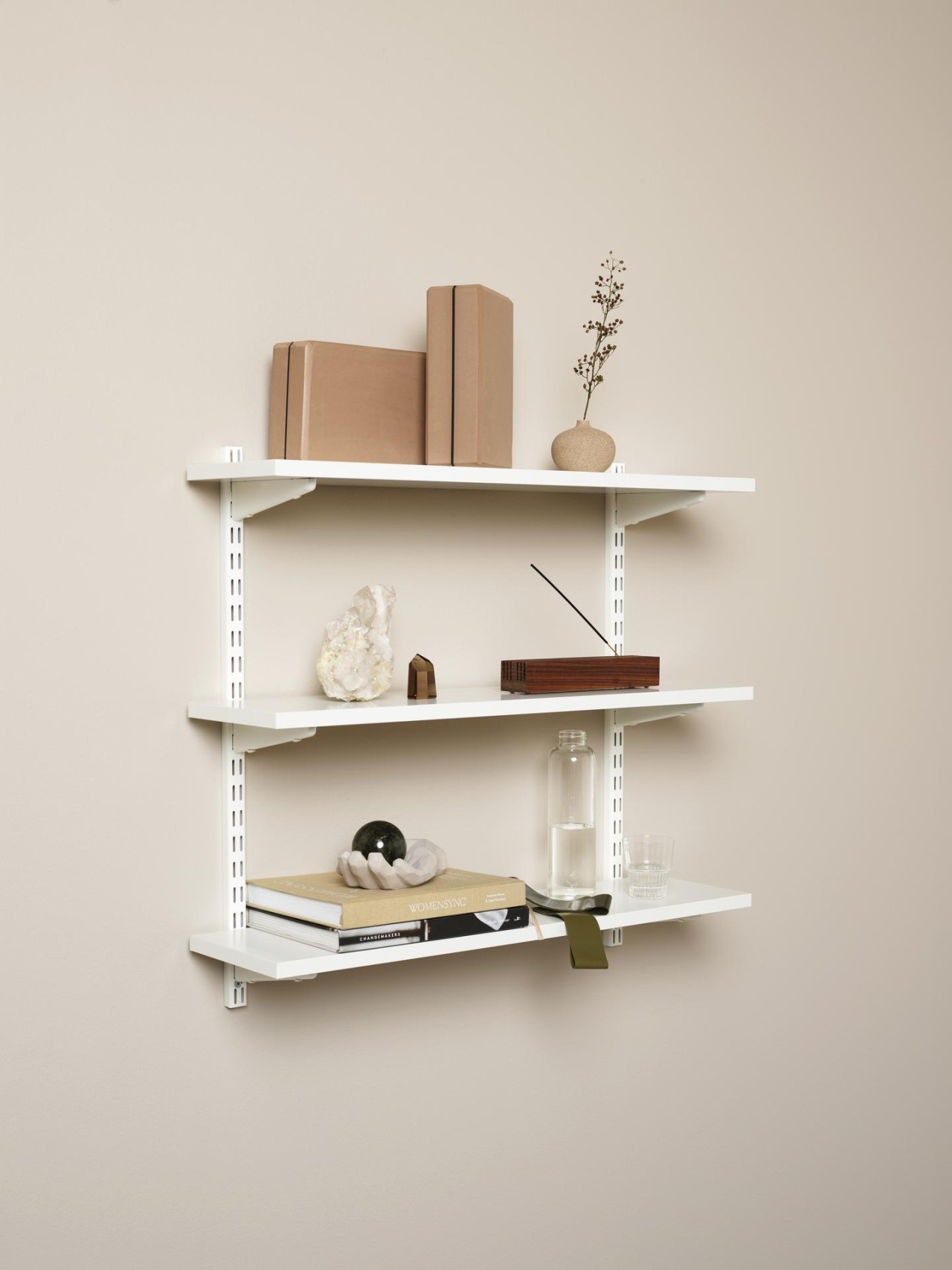 Konsol ämnad att bära solida hyllplan, exempelvis melaminhyllor. Hakas fast i väggskena.