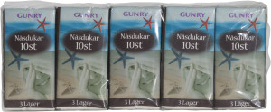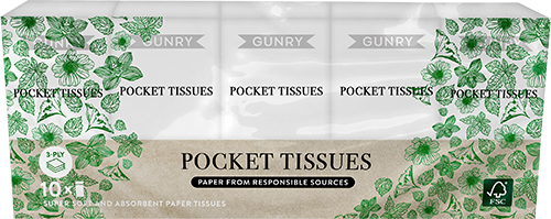 Mjuka och sköna näsdukar från Gunry i en förpackning med 10 paket innehållandes 10 näsdukar i varje. Smidiga att ha med sig i handväskan eller fickan. Varje näsduk består av 3 lager mjukt papper som är extra skonsamma.