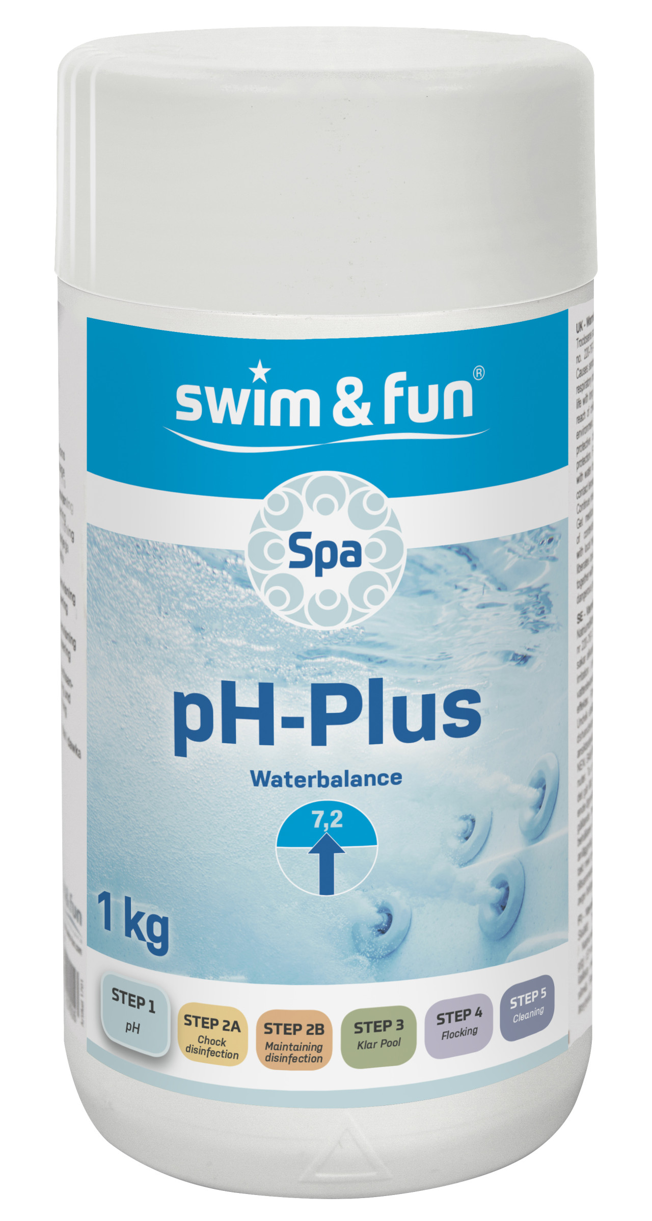 Spa pH-Plus-granulat används för att höja vattnets pH-värde när det är under 7,0. Friskt badvatten har ett pH-värde mellan 7,0 och 7,4. Med en hälsosam vattenbalans får du den bästa nyttan med vattenvårdsprodukter. När pH-värdet är för lågt kan vattnet vara aggressivt mot metalldelar i spaet. Om pH-värdet är lägre än 7,0 ska det höjas med pH-Plus. Om värdet är över 7,4 ska det sänkas med pH-Minus. Vattnets pH-värde testas kontinuerligt med Swim & Funs SPA testremsor.