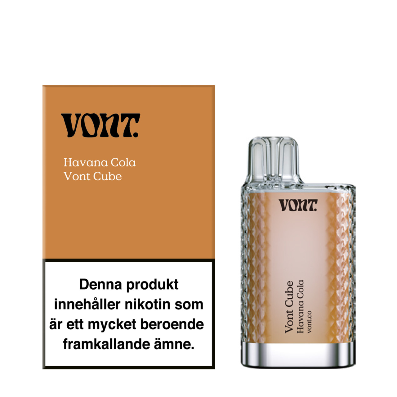 Vont Cube Havana Cola 800 är en engångsvape från Vont med smak av cola. Produkten räcker upp till 800 puffar och finns i styrkorna 20 mg