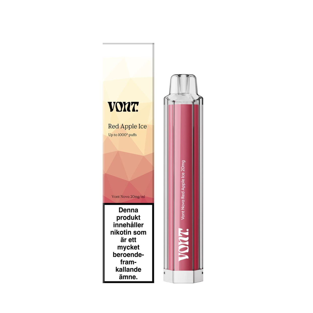Vont Nova Red Apple Ice 1000 med smak av röda äpple, frukt och mentol. Denna engångsvape ger cirka 1000 puffar och är avsedd att kasseras efter användning.